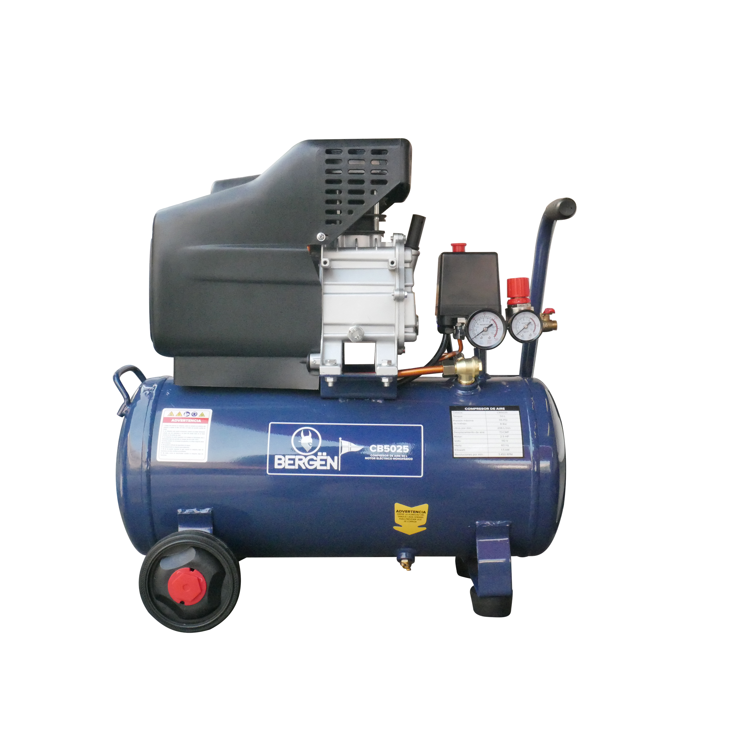 Compresor eléctrico bergen cb5025 para uso doméstico e industrial pintado de paredes, barnizado de muebles, limpieza de áreas de trabajo. necesarios para trabajos de: carpintería, herrería, llanteras entre otros.