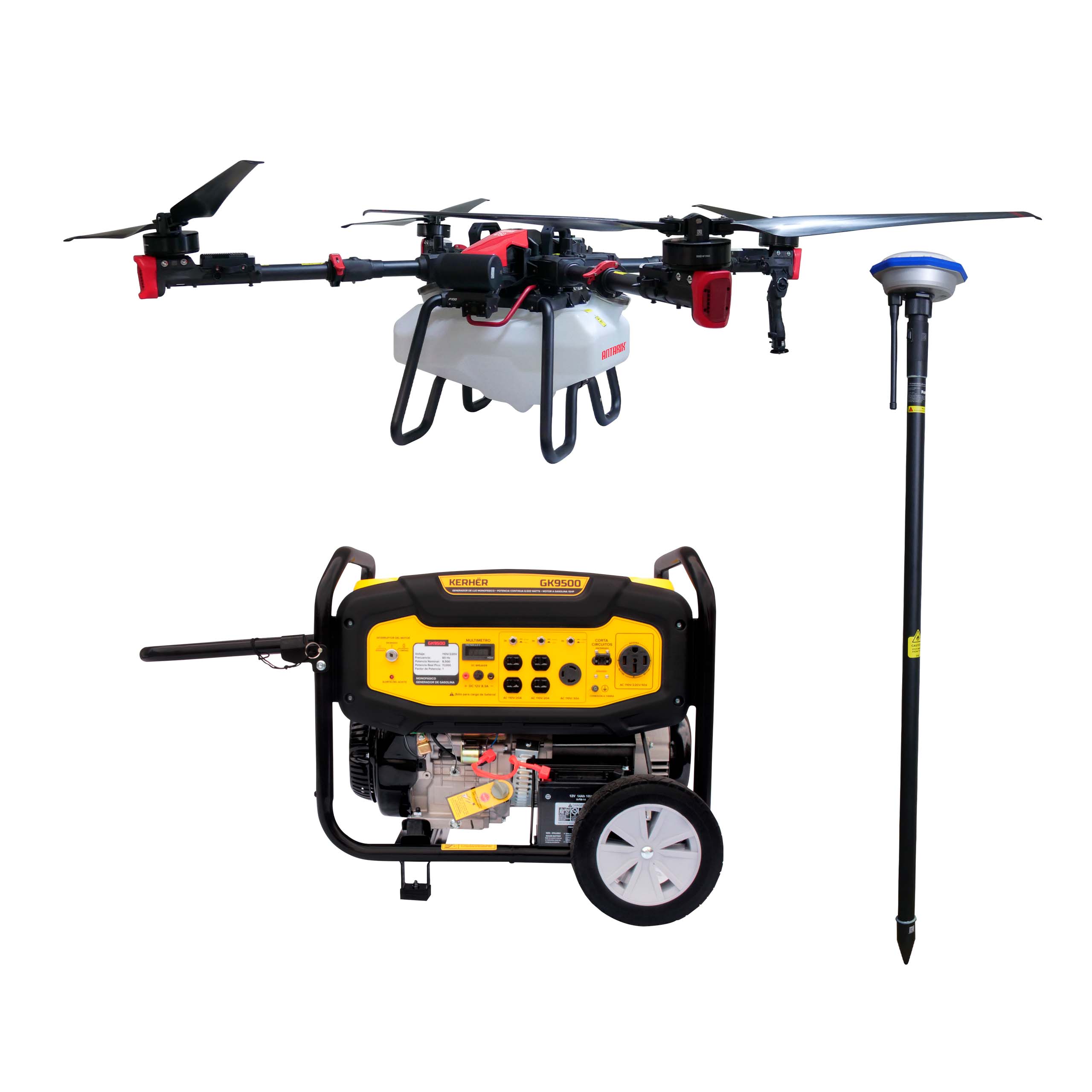El aspersor agrícola antarix dron D50GE representa la nueva generación de equipos tecnológicas diseñadas para optimizar las labores agrícolas con máxima precisión, eficiencia y control. equipado con cuatro baterías de alto rendimiento, tanque enfriador, dos cargadores, control remoto, generador gk9500 y estación rtk, este sistema ofrece autonomía, estabilidad y precisión en cada aplicación.