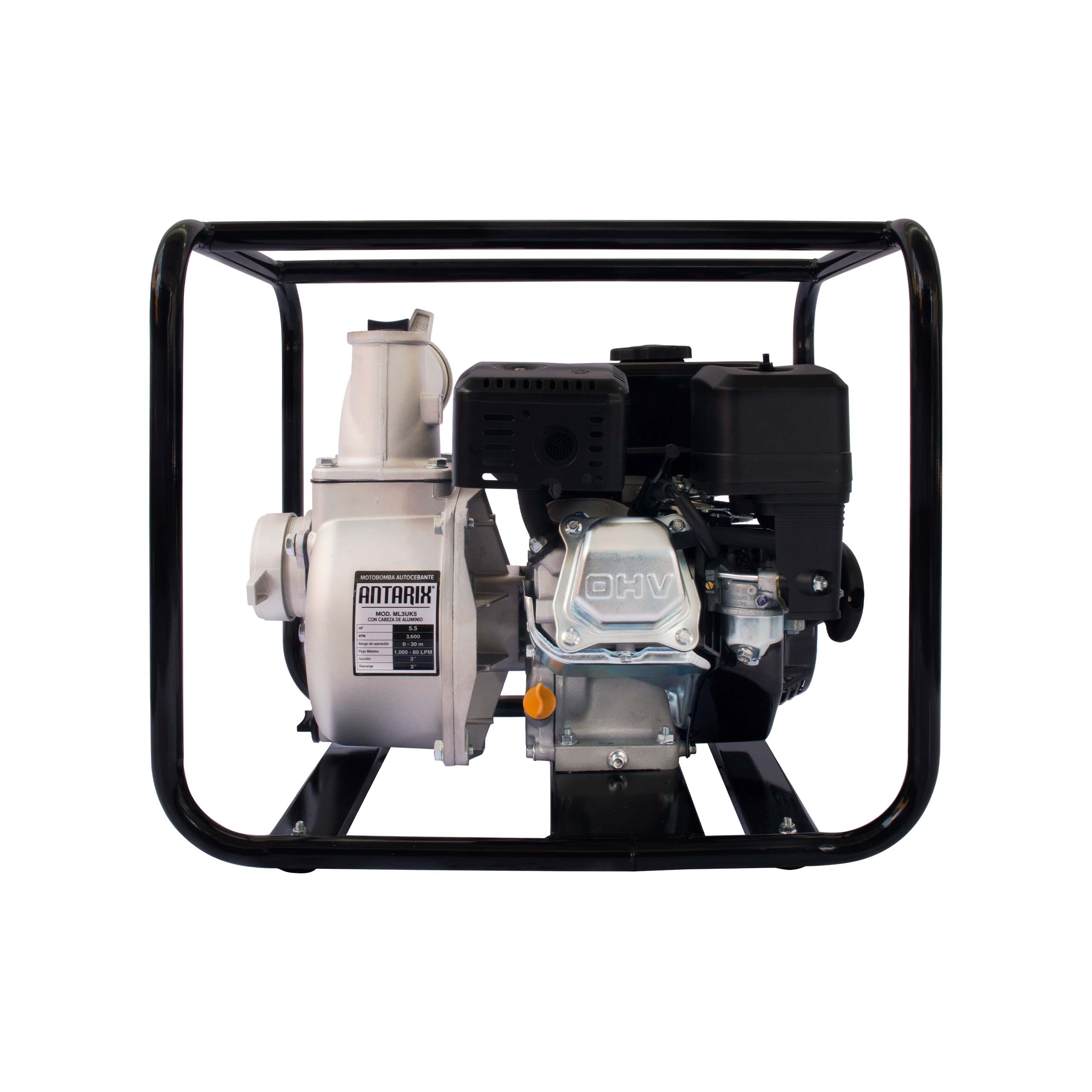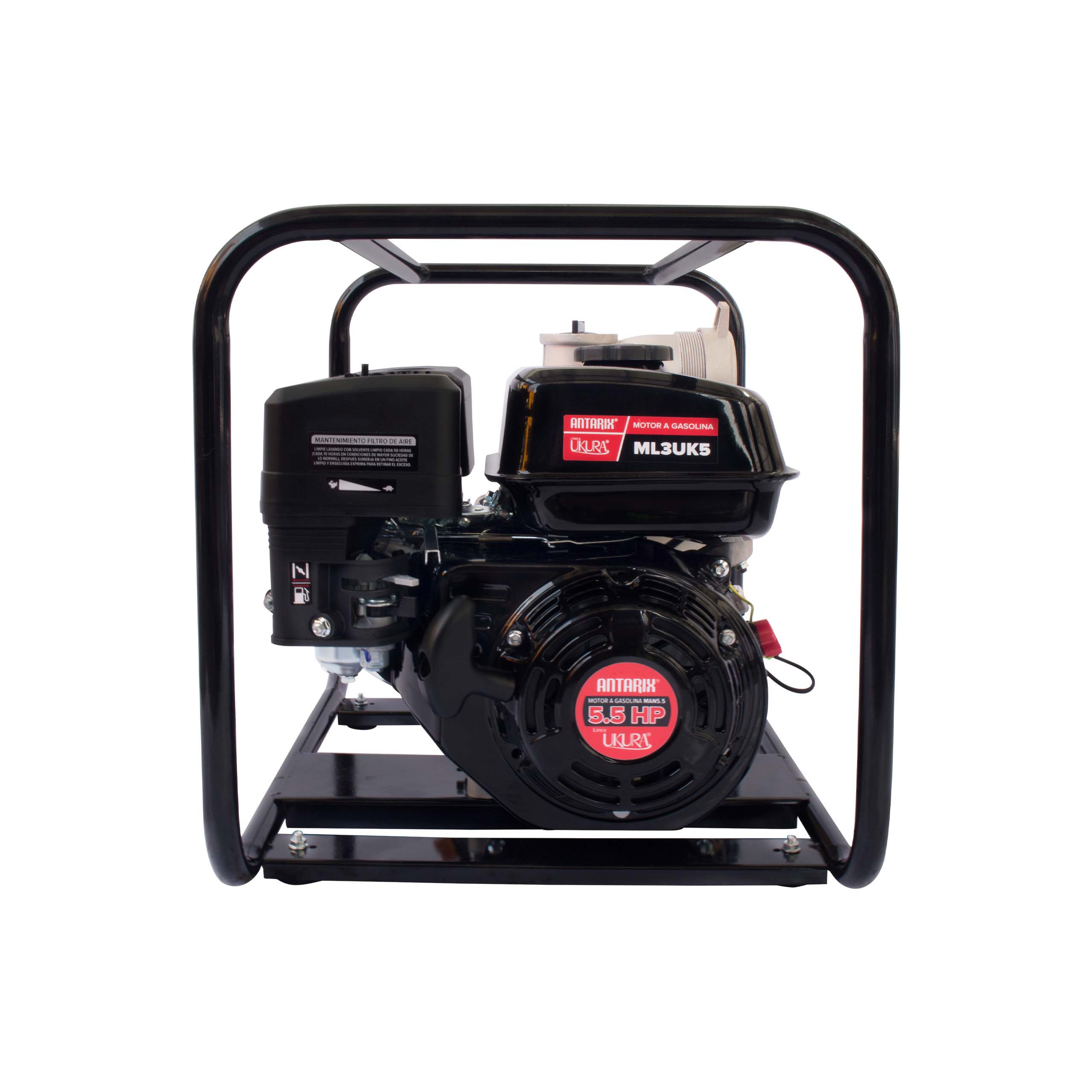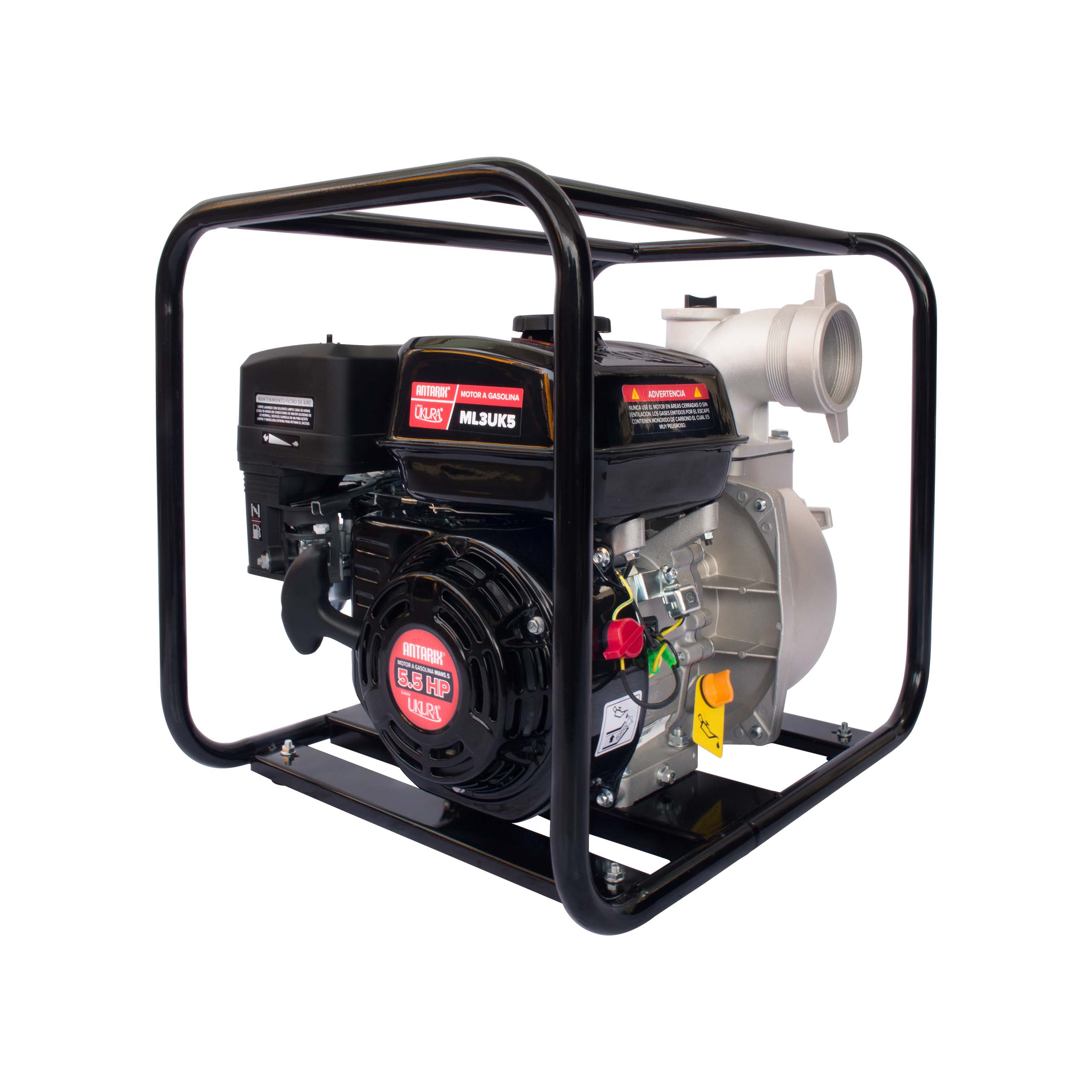 Modelo ML3UK5 de ukura: equipo de riego autocebante a gasolina de 5.5 hp con conexiones de 3? x 3?, diseñado exclusivamente para labores agrícolas. ofrece un caudal de hasta 1,000 l/min y una altura máxima de 30 metros, facilitando la irrigación eficiente y el manejo del recurso hídrico en la tierra.